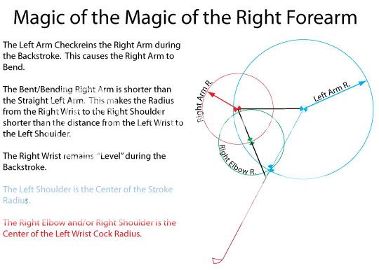 The Center of the Radius of the Left Wrist Cocking Motion is the Right Elbow and Right Shoulder. They travel a smaller Radius than the Left Arm and thus Cock the Left Wrist as the Club is Raised to the Top of the Swing.