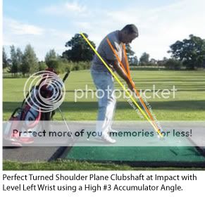 My post has been incubating for years. The illustrations took a few minutes. But they aren't Impact Illustrations. At Impact, even on the Turned Shoulder Plane, ideally the Left Wrist is Level. Therefore, there will be an angle between the left arm and clubshaft. It's reduced because of the necessity to reduce the #3 Accumulator Angle to use the Turned shoulder Plane, but it nonetheless exists.