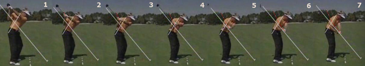 I used a spline tool to trace the butt end of the club at the left hand to trace the movement of the flat left wrist unit during the downswing. One can see that the sequential movement of the "left wrist uncocking unit" forms a curved path. One can also see that the curved left hand path intersects the inclined plane in image 5, at which time the back of the left hand is also parallel to the inclined plane and the clubshaft is on that plane - and that supports my previous post where I stated that the left wrist uncocking phenomenon occurs on a curved plane that only intersects the single inclined plane "somewhere" in the mid-downswing.