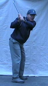 Adopt a golfers posture and then perform a backswing action (without a golf club) and stop at the end-backswing position - ensuring that you have made a 45 degrees pelvic rotation and a 90 degrees shoulder rotation (relative to the ball-target line). Have a friend stand directly behind you and get him to place his right palm on the front of your right shoulder, so that he can prevent your right shoulder from moving forward, and so that he can sense the "pull" on your right shoulder as you perform the next maneuver. Then perform a hip squaring action - an initiating hip shift rotation move.