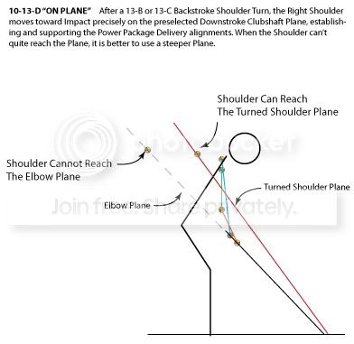 If I understand this correctly, the shoulder turn is a flatter one in which the right shoulder traces the tsp into impact. I'm confused on what is bold. 10-13-B FLAT This is a relatively flat Backstroke Shoulder Turn which places the Shoulder “On Plane” for any Plane Angle with a flatter angle than the Rotated Shoulder Angle. A Flat Down-stroke Shoulder Turn can serve only to impact a circular motion to the Stroke, but almost irresistibly “Off Plane.” 10-13-D ON PLANE After a 13-B or 13-C Backstroke Shoulder Turn, the Right Shoulder moves toward Impact precisely on the preselected Down-stroke Clubshaft Plane, establishing and supporting the Power Package Delivery alignments. When the Shoulder can’t quite reach the Plane, it is better to use a steeper Plane. |