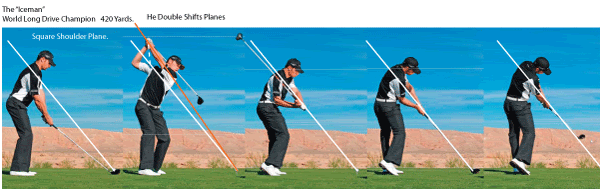 Obviously, you mis-perceive this matter. You've been hanging with the Bucket too long and the grease has finally gone to your brain. Allow my Vapid response to help clear things up. First and Foremost is your misconception about the TSP. It's not a fixed Plane. Its angle varies by Club Length. The Shorter the Club Length, the Steeper the Angle. OB1: "OK daryl you jerk, then if the TSP angle is different for each club, then what does a Flat Shoulder turn mean?" Daryl: It simply means any angle flatter than a Rotated shoulder turn. OB1: "OK daryl, smarty pants, then how does one know how flat to turn your shoulders for any specific club length?" Daryl: Each Clubs Length changes the angle of the Right Forearm at Address. Then, using Extensor Action Takeaway, your Right Shoulder will be directed to the appropriate height and Location per that angle (Magic of the Right Forearm). Longer Clubs will result in a "Lower Right Shoulder" and Shorter Clubs will raise the Right Shoulder Higher. So, given a short enough shaft, its possible for a Properly applied Flat Backstroke Shoulder Turn to direct the Right Shoulder to the Same Location as a Rotated Shoulder Turn. But it's still called a TSP if it arrive On Plane by Geometrically aligned forces and not a simple 90 degree shoulder-spine rotation. Isn't it obvious to everyone that while using the Elbow Plane, that one cannot have an On-Plane Downstroke Shoulder Turn? EVER. Someone let 'Bucket' know. |