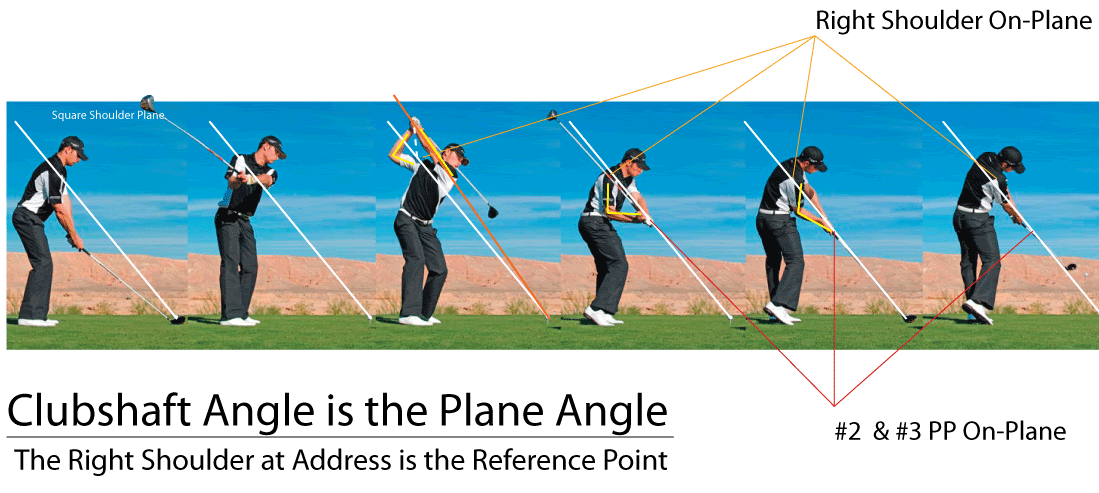 At address and through the ball for structural (RFFW) and tracing (the straight plane line) reasons the Right Forarm is ideally on the same plane as the clubshaft's lie angle. The Right Forearm is said to be on this plane when the Right Elbow is on this plane. This is the Elbow Plane one employs through Impact. To accomplish this and a Level Left Wrist, adjustments must be made to your Head position, knee bend, waist bend, distance from the ball etc. These adjustments, if not done at Impact Fix will necessitate an identical adjustment dynamically when you are swinging......not the best thing for your consistency. This is a major cause of faulty Impact Alignments. The Turned Shoulder Plane (TSP) is a line drawn from the Plane Line through the Right Shoulder when it's "turned" to its position at Top. This Plane Angle is dependent on many things including the type of Shoulder Turn employed. Generally the Flatter the Shoulder Turn going back the closer this Plane Angle is to the Shaft Plane or Elbow Plane. The Turned Shoulder Plane allows the Right Shoulder to take the Power Package down the TSP towards the Plane Line in Startdown. An On Plane move of the Power Package via the Right Shoulder referred to as an On Plane Shoulder Turn. Flat back and On Plane coming down. The shoulders dont turn on a single plane for the Standard Shoulder Turn anyways. However the TSP is not the same Plane Angle as the Elbow Plane and so the Plane Angle of the Inclined Plane must shift to this lower Elbow Plane angle prior to Impact. This is achieved as easily as it was to shift to higher Plane Angle in the Backstroke if you Addressed the ball with a Level Left Wrist at Fix. It just sort of happens as the Right Elbow unbends, the reverse situation of Right Forearm Pickup. If you Pickup you must let it down, CF helps out in this regard. The reference in 10-6-B to "any Plane Shift being hazardous" relates to a selection of an Inclined Plane Angle other than a TSP angle at Top which would necessitate a shift back to a TSP angle prior to an On Plane Shoulder Turn in Startdown. Logic holds that any plane shift is hazardous yes but some shifting does happen. Keeping it to a minimum is what its all about while using your Right Shoulder to take the Power Package down plane as the initial move in Startdown. For this to happen you have to employ a TSP angle. The closer to the Elbow Plane angle the better. |