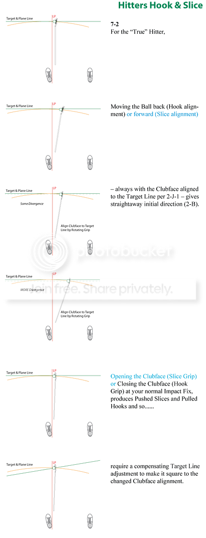 To decipher 7-2 I believe one needs to understand Homers definition of a True Swinger. Tell me how I'm doing here: CF alone aligns the clubface which to Homer meant (amongst other things) that as the ball is moved back in the stance the grip is not "Rotated". See 6-H-0 IMPERATIVES E and F points #3. E Being Hitting and F ( True) Swinging. What does this mean to impact geometry? Given that the True Swinger doesnt Rotate hIs grip as he moves the ball back in his stance his clubhead moves back and the face opens accordingly. To compensate for this open face he Rotates his Plane Line to the left to square the face to the target but in so doing creates a divergence in Path and Face which if given enough speed, not too much loft etc will tend to produce a fade. The Manipulated Hands Swinger or the Hitter on the other hand will (amongst other things, Hinge Action for instance) Rotate the Grip for balls played back so as to square the face to the target. As the ball moves back along the inside/out Arc of Approach there is also divergence this time tending towards a draw. It had me stumped for a while but I think got this one particular riddle figured out......maybe. You know Homer had it all figured out but the way he explained things was not his strongest suit it would seem. But, that said, if you ever try to rework his writings .......you fall flat on your face. It aint nearly as easy at it seems. I wish he'd done more drawings, like yours for instance, D. When BerntR and Bear finish with their time machine (they're getting really close they tell me) we'll have to send you back to Homers lab so you can help him out with some drawings for his book. Man he'd loved that opportunity I bet. |