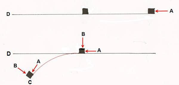 What happens after 10 minutes? The box ends up at point C rather than destination point D (bottom diagram). The reason is that there is another force present that deflects the moving mass from its straight line path. In other words, that other force changes the direction of the movement of the moving mass, so that it follows a circular path instead of a straight line path. Note that the other force pushes at right angles to the circumference of the circular path - and that it is therefore directing its force towards the center of a hypothetical circle.