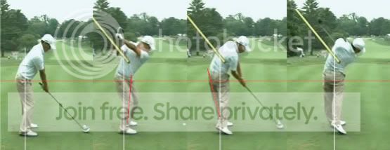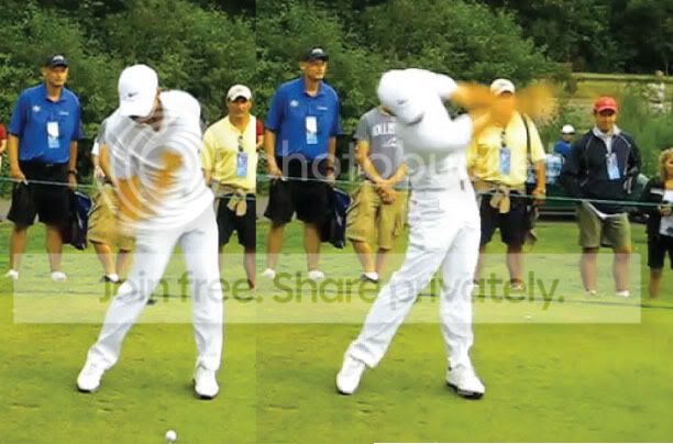 His Left Hip rotates away from the Target Line as his right hip travels down the line because AK Pivots around the inside of his Right Leg. His "un-centered" Pivot (ala Ben Hogan and AKA Homer Kelley's "Right Anchor") gives his Left Hip a wider range of motion than his Right Hip. His Left leg becomes straight as the distance increases between his left hip and left foot. This is very noticeable in any Down-the-line view of his swing. Notice that his Hip Turn is level-ish compared to Tigers (tigers is more slanted). Tiger uses muscular effort to "Snap" the Left Knee straight at Impact. Purposely straightening the Left Leg causes his left Hip to rise which causes his Hip Turn to truncate. A few years ago, Tiger said he used that procedure when he wanted a little extra yardage ( ya, that seems to be working).